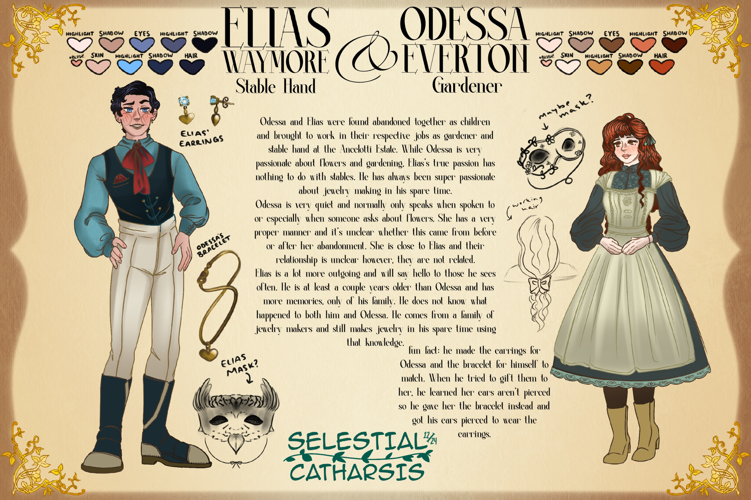 Aurelia & Aurora Ruxherd- cousins and ladies-in-waiting to Princess Dahlia. As they are related to the royal family, they are given more freedom than most attendants. Aurelia took up sewing as a child and now provides most of dahlia's wardrobe. Aurora helps in the sewing process however, she is more passionate about designing them herself. since these are hefty tasks, they are often not with princess Dahlia, just as she prefers.