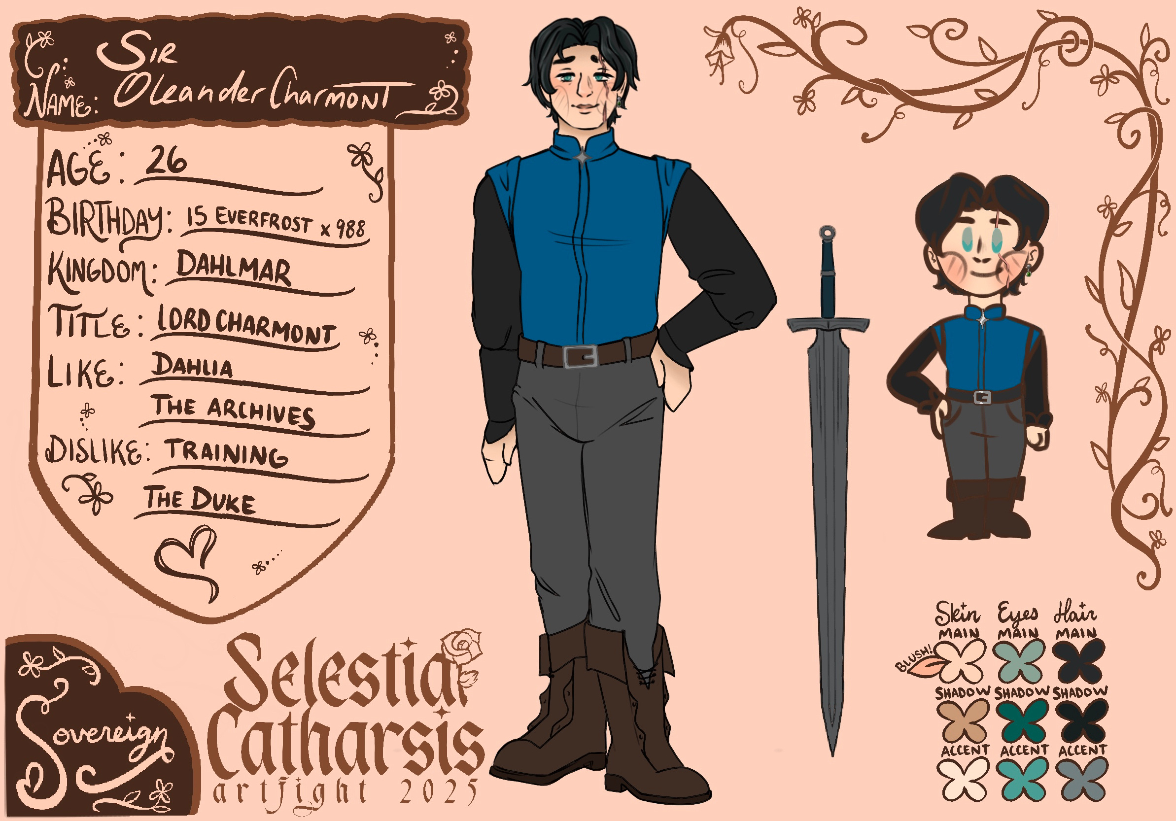 Duke Cedric Charmont- Bastard Son of the previous king, Brother to the current king. he's deeply untrusting and cautious of outsiders. Duke Charmont is also commander of the royal army and is frequently found supervising and correcting soldiers out in the training grounds.