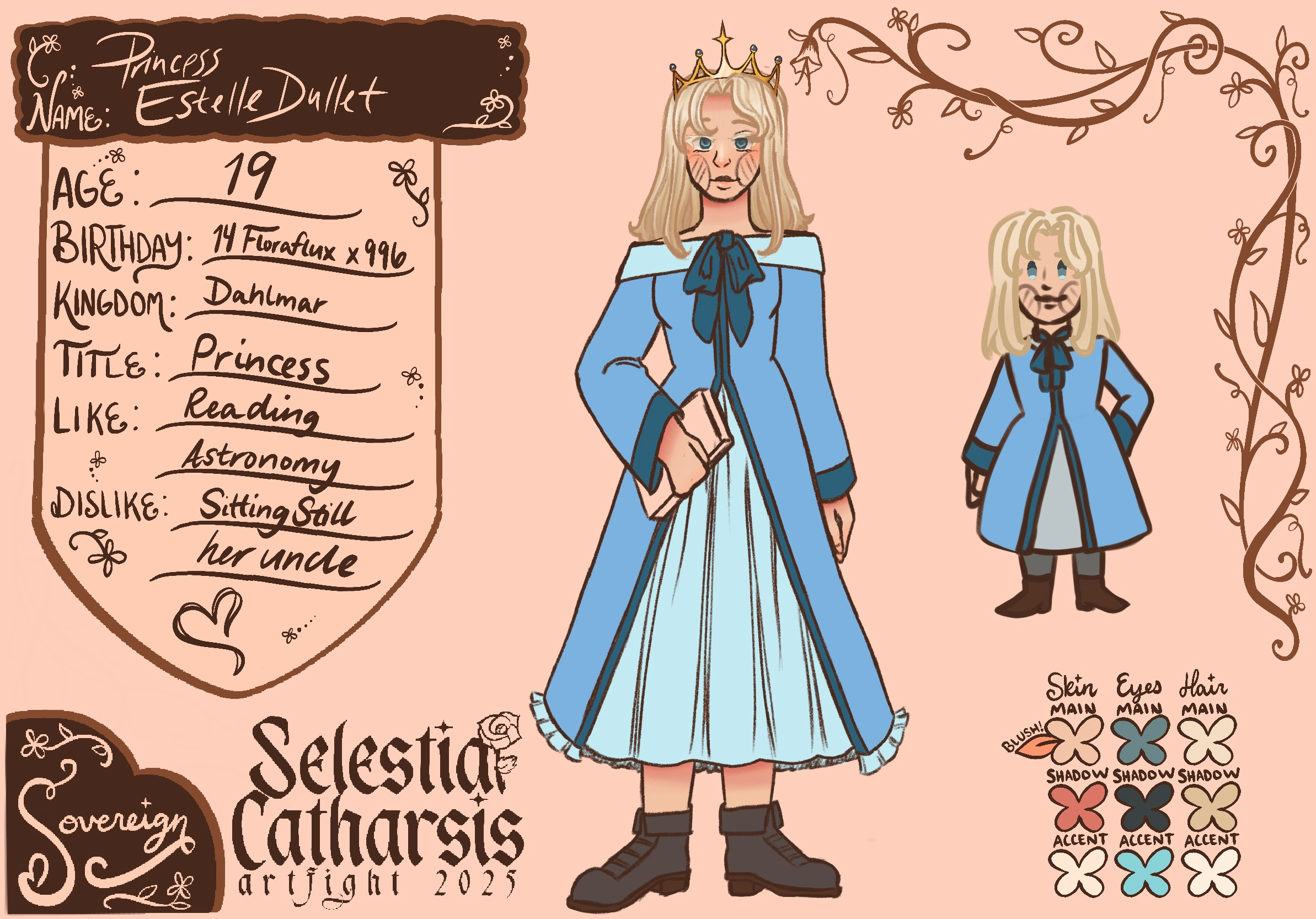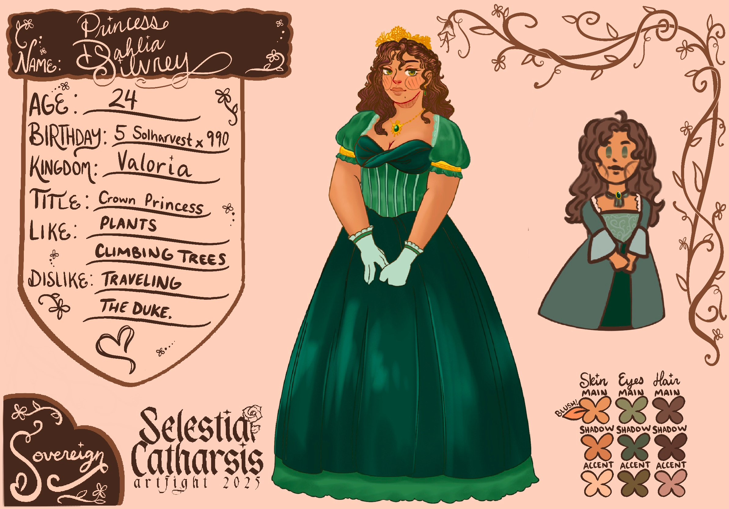 ʜᴏʙʙʏ: climbing trees, weaving flowers/ grassꜱʜᴏʀᴛ ʙᴀᴄᴋꜱᴛᴏʀʏ: Following the death of her father, Dahlia was sheltered within the palace walls in the year 1000 at ten years old. While Dahlia was still able to socialize with the high ranking officials/ town members who came to the palace, as well as the staff, she mostly remained socially deprived leading to her spending more time wandering the expansive palace grounds and causing trouble. She wants nothing more than to leave the palace and one day, she gets her wish. A queen of a neighboring kingdom and longtime friend of her mother’s writes to Dahlia, inviting her to observe their court, a custom for most young royals. Queen Delilah originally objects but eventually agrees, on the condition her two ladies-in-waiting join her on her journey.